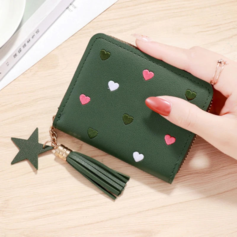 Uma Carteira com estampas de corações, Com multiplas cores disponíveis.
